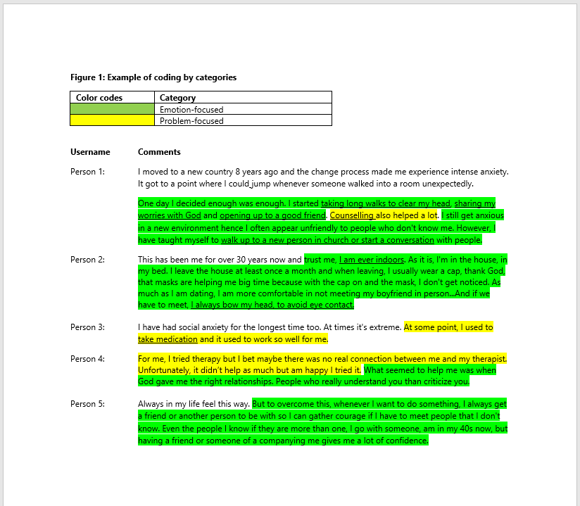 The research materials are read and all text that on first impression appears to represent a predetermined category is highlighted. Any text that does not fit into these categories is assigned a new category. For our use case, user comments that were related to problem-focused coping strategies were highlighted in yellow while sections of the comments relating to emotion-focused strategies were highlighted in green. A sample of this categorization is provided in Figure 1.